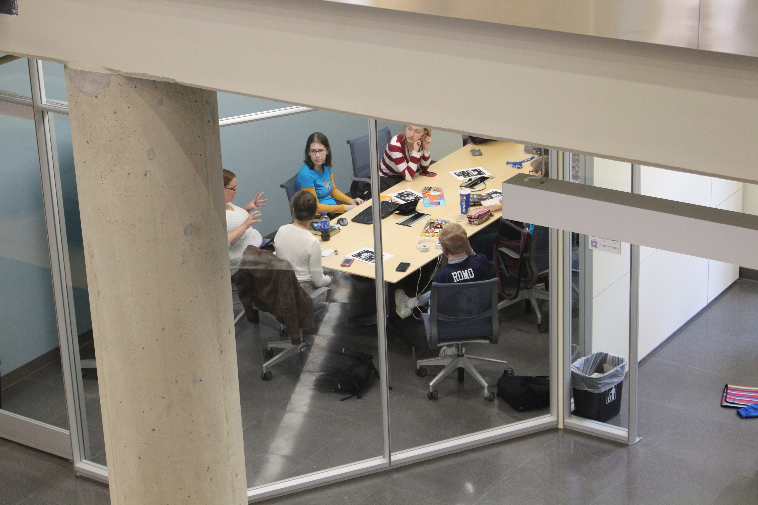 Three collaboration rooms are located on the second floor of the HCC. Each room contains a flat-panel display and a PC computer. Users may use the local computer to work collaboratively on the display, or they may hook up their own laptop computers via VGA or HDMI connection.